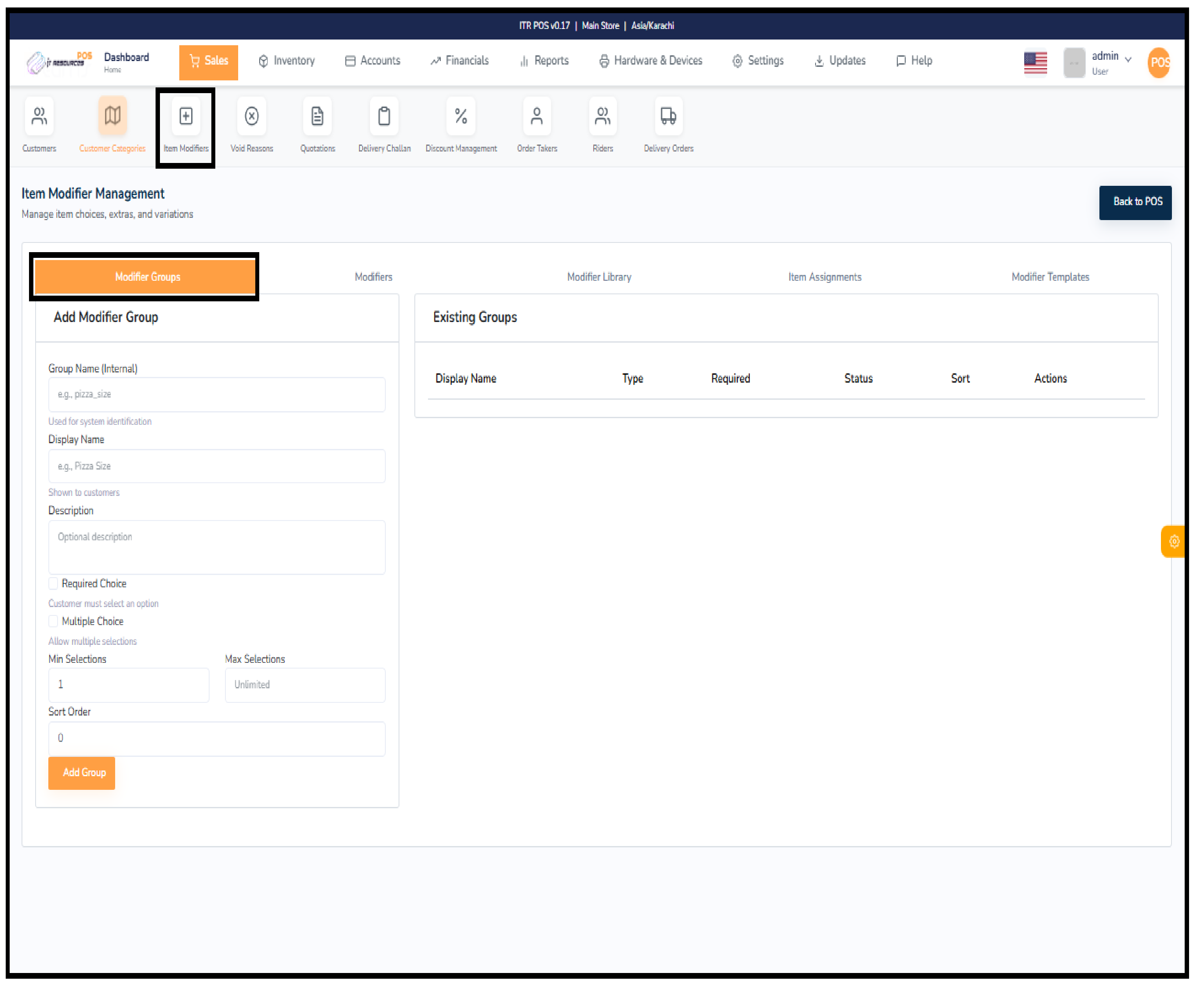 Create groups of related modifiers (e.g., size options, variations, features).